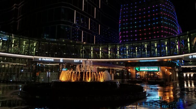 Foto itu menunjukkan suasana malam yang ditangkap dengan kamera depan Oppo F5. Foto tersebut memperlihatkan gambar bangunan dengan taburan lampu yang tajam dan detail.