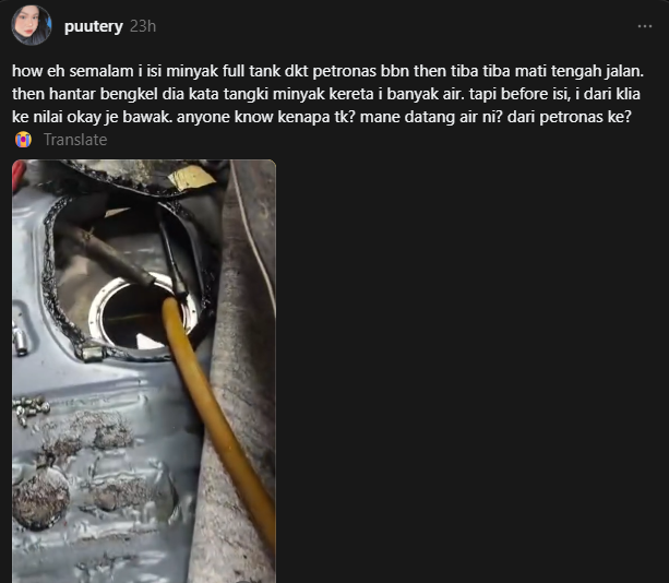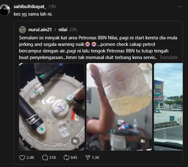 Seorang lagi pengguna, @nurul.ain21, memaklumkan keretanya mengalami simptom ‘jerking’ dan beberapa lampu amaran menyala, sebelum mekanik mengesahkan petrol yang diisi bercampur air.