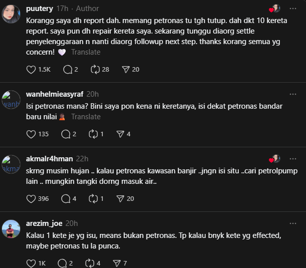 “Korangg saya dh report dah. memang petronas tu tgh tutup. dah dkt 10 kereta report. saya pun dh repair kereta saya. sekarang tunggu diaorang settle penyelenggaraan n nanti diaorg followup next step. thanks korang semua yg concern!” kata puutery ketika memberi kemas kini terbaharu.