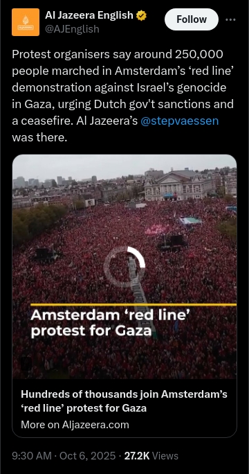 Menurut laporan antarabangsa termasuk Al Jazeera English dan beberapa portal tempatan di Belanda, lebih 250,000 orang dilaporkan menyertai perhimpunan Amsterdam Gaza bagi menuntut hentikan perang Gaza dan menunjukkan solidariti untuk Palestin.