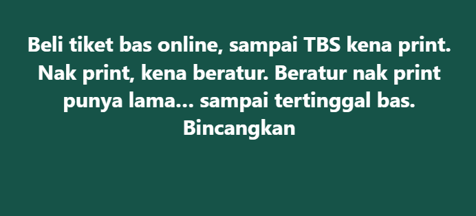 “Beli tiket bas online, sampai TBS kena print. Nak print, kena beratur. Beratur nak print punya lama… sampai tertinggal bas!”