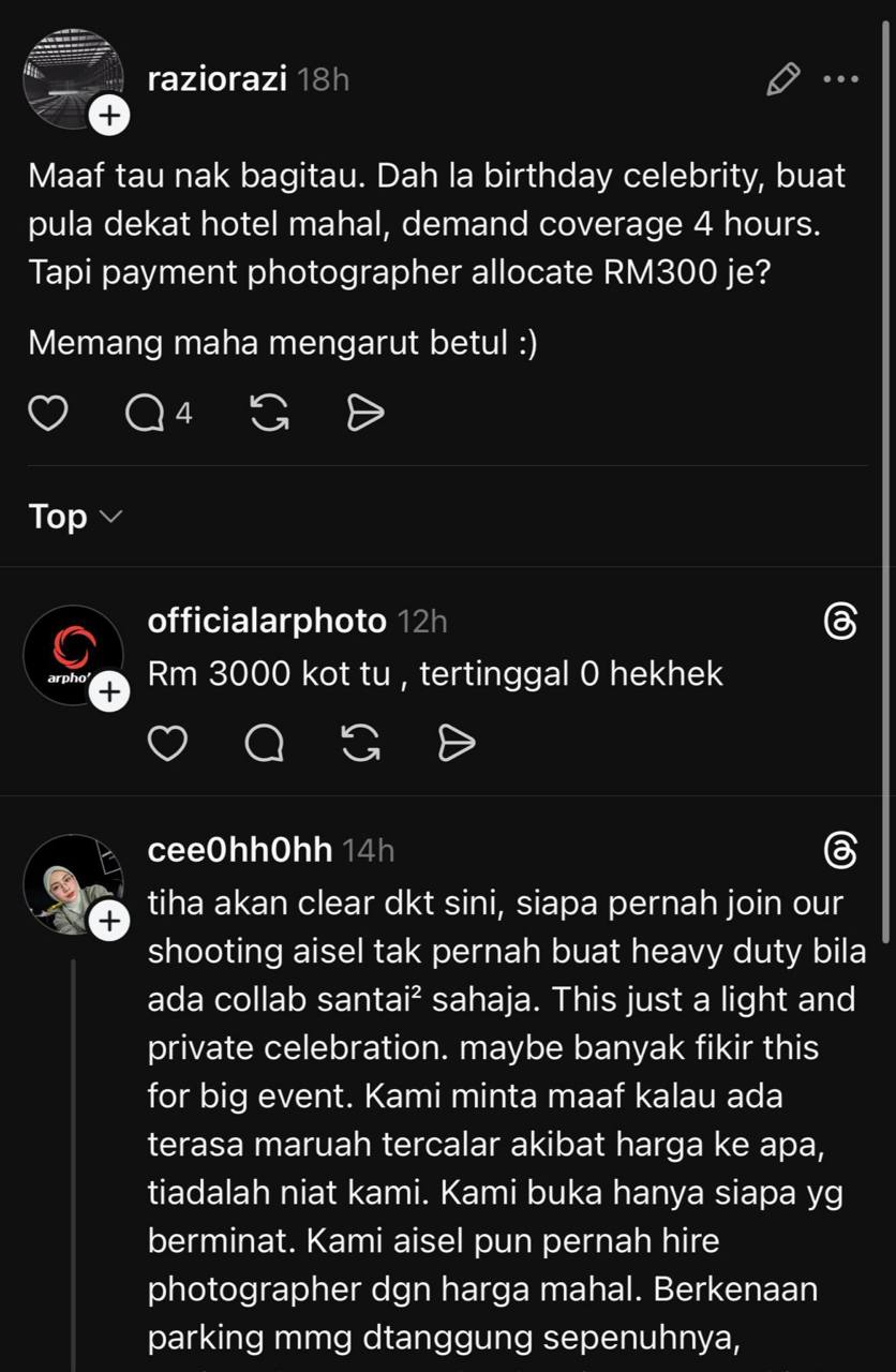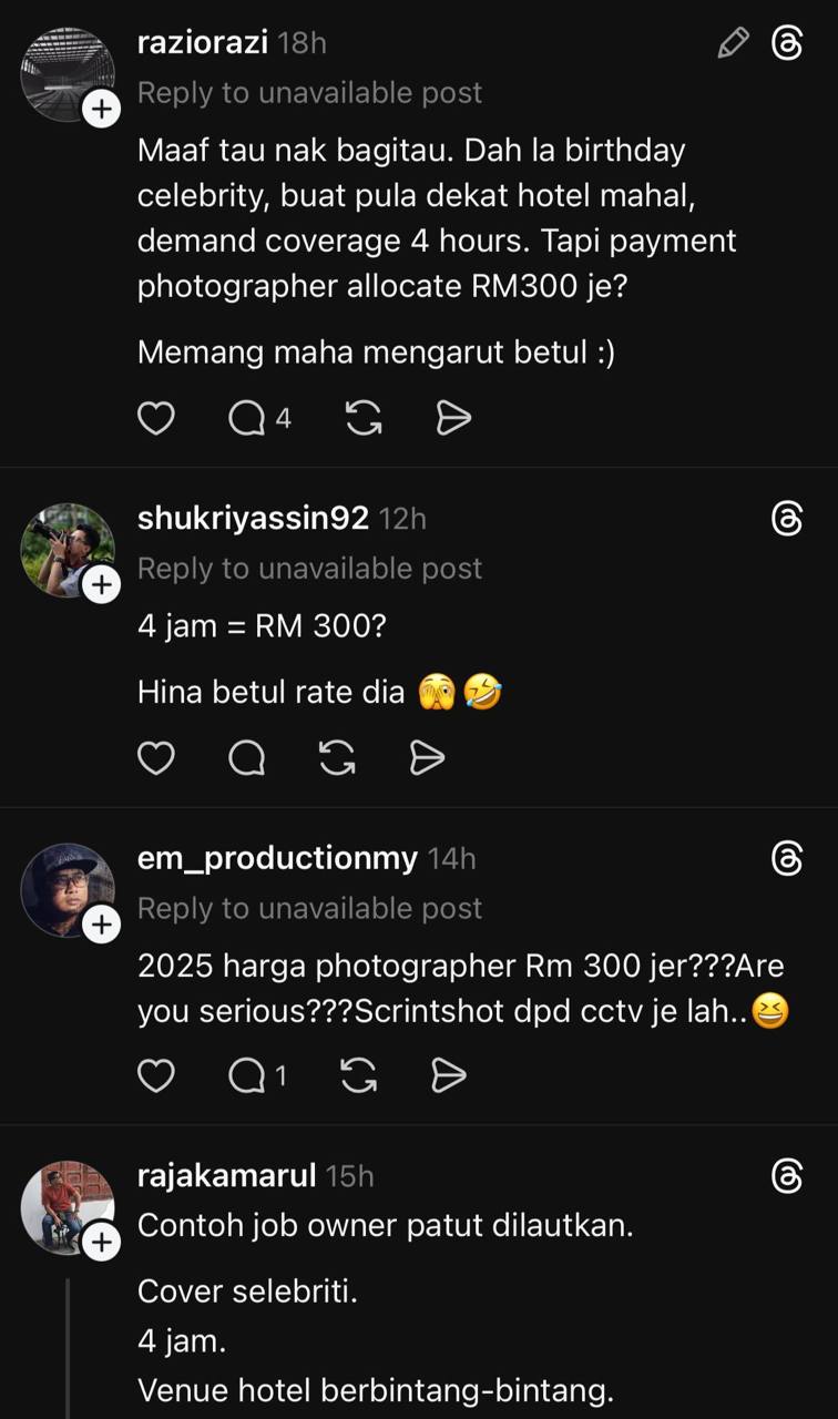“Dah la birthday selebriti, buat pula dekat hotel mahal, demand coverage empat jam tapi bayar RM300 je? Memang mengarut betul,” tulis individu berkenaan.
