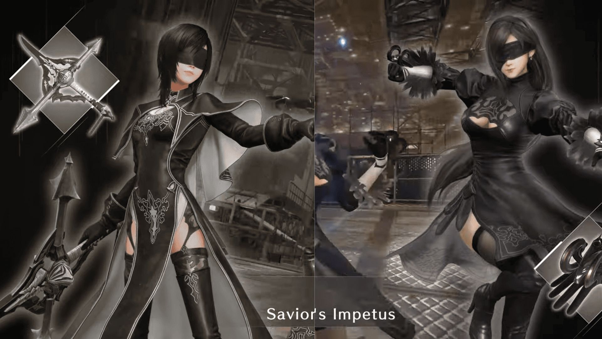 • Blindfold dan Android-style outfit menyerupai 2B