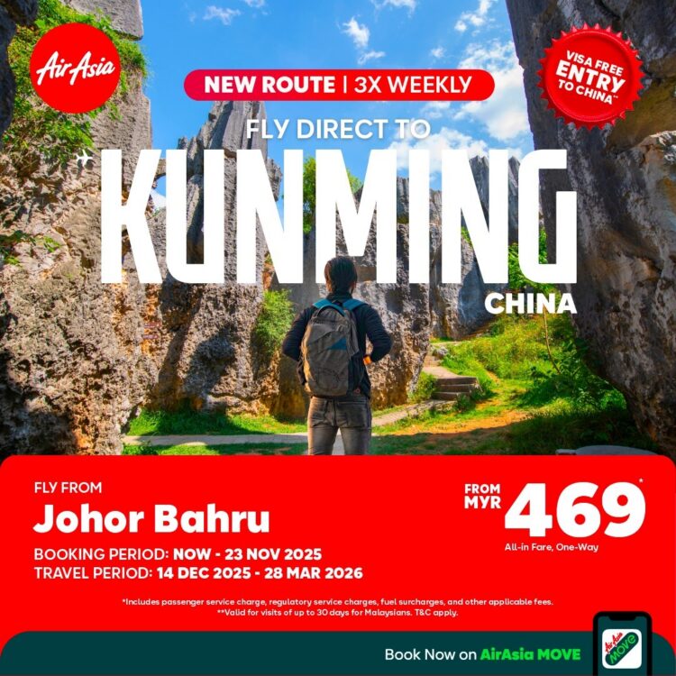 Baru sahaja diumumkan yang AirAsia Malaysia melancar laluan terus baharu dari Johor Bahru ke Kunming, China, yang akan bermula pada 14 Disember 2025.