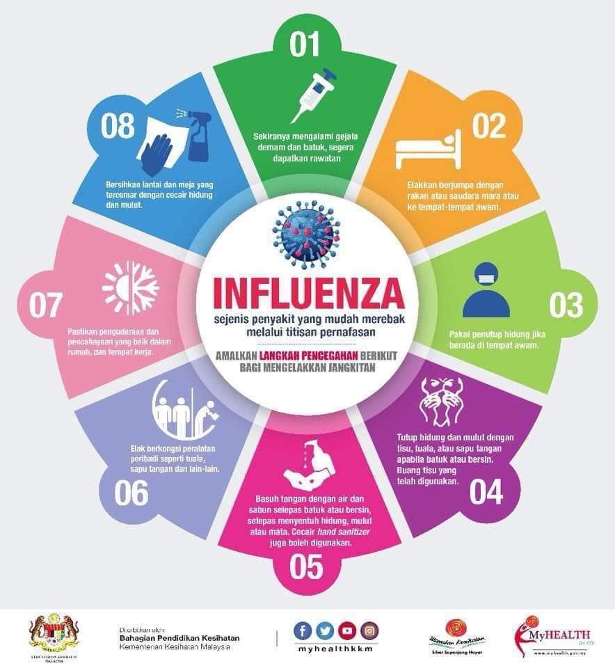 Bagi yang masih keliru, influenza bukan demam biasa. Simptomnya boleh datang tiba-tiba. Contohnya,demam tinggi, batuk, sakit tekak, lenguh badan, hidung berair, dan keletihan yang melampau.