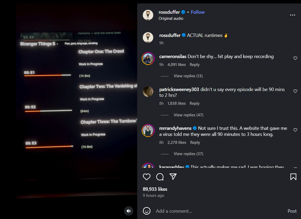 Sebelum ini, tular spekulasi bahawa setiap episod bakal berdurasi lebih 90 minit selepas Duffer menyamakan musim kali ini dengan “lapan filem blockbuster“.
