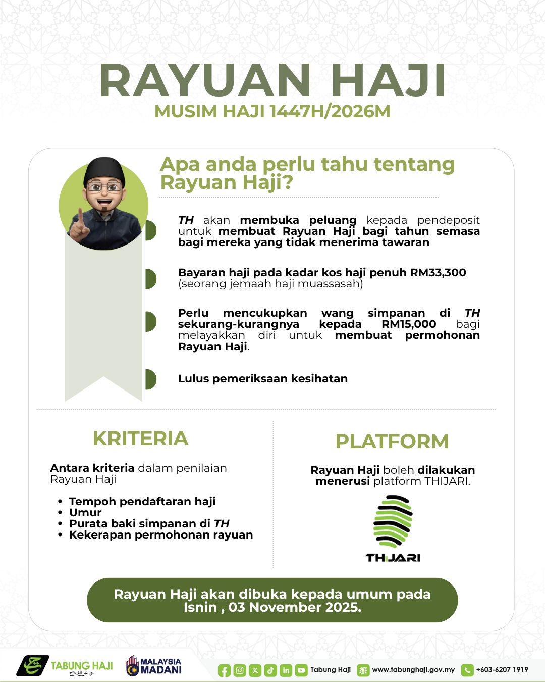 Selain itu, para pendeposit diingatkan untuk tidak menggunakan perkhidmatan pihak ketiga atau individu tidak sah yang menawarkan bantuan rayuan haji, sebaliknya hanya membuat permohonan melalui platform rasmi THiJARI.