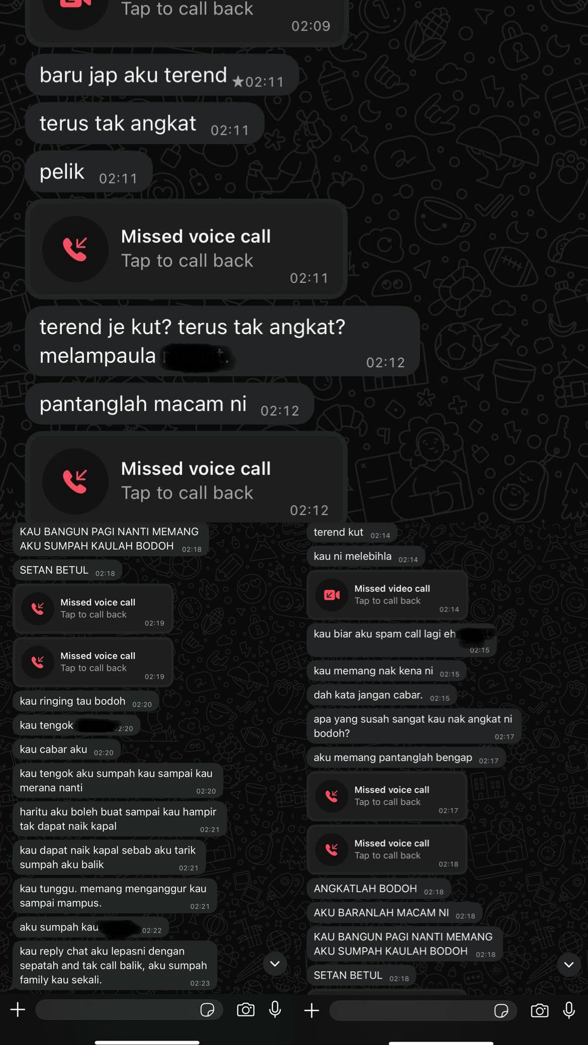 “Kau reply chat aku lepas ni dengan sepatah and tak call balik, aku sumpah family kau sekali.”